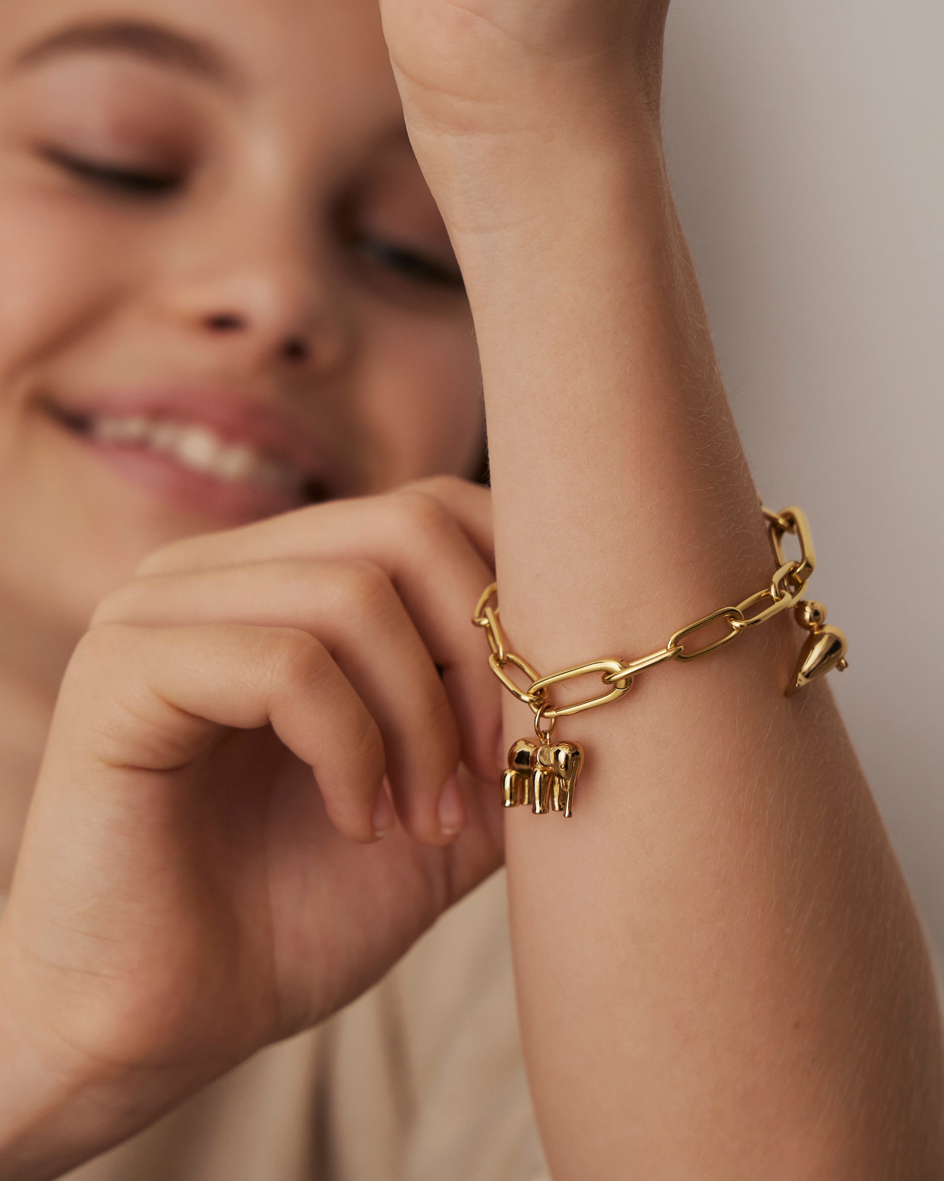 Kæden består af fine led med tre særlige led, der kan åbnes. Her kan du indsætte vedhæng fra Kay Bojesens kollektion og skabe et personligt udtryk. Med armbåndet følger et lille udskåret abehoved – et ikonisk symbol på Kay Bojesens legende designunivers.